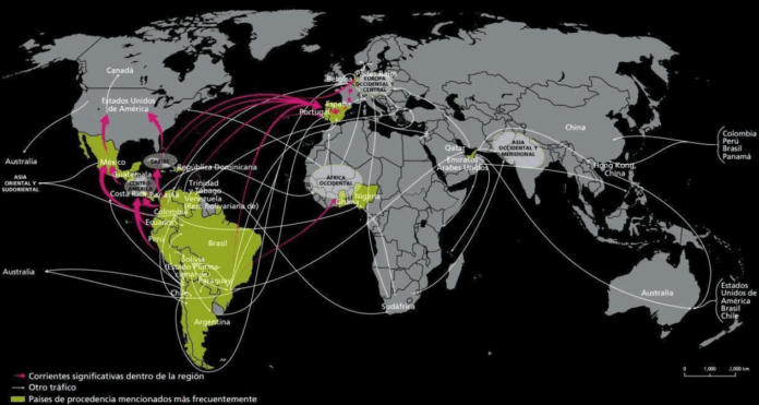El mapa del narcotráfico es un tablero que combina rutas terrestres, aéreas y marítimas, donde cada línea de transporte equivale a vidas truncadas y democracias debilitadas. Desde los valles cocaleros en Colombia, Perú y Bolivia, la cocaína fluye hacia Centroamérica, México, el Caribe y el Cono Sur, antes de alcanzar Estados Unidos y Europa. Carreteras, pistas clandestinas, lanchas rápidas y “narcosubmarinos” constituyen la infraestructura invisible de un negocio que desafía los controles fronterizos y la cooperación internacional.